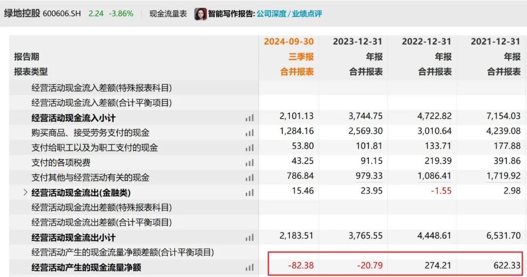 绿地控股自2021年以来经营性现金流净额持续减少,2023年开始转负;2024年三季度,公司经营性现金流净流出约80亿,公司流动性风险大增。