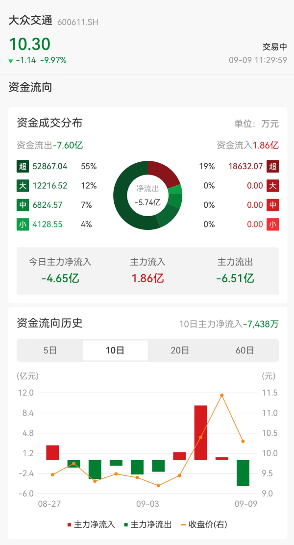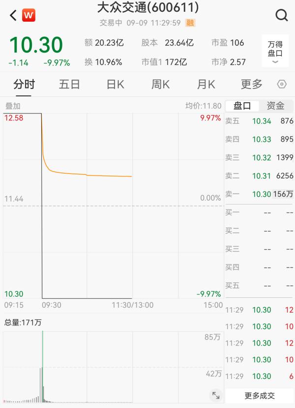 9月9日,大众交通开盘即涨停,成交额近18亿元,随后直线跳水跌停。截至午间收盘,大众交通跌9.97%,报收于10.30元/股,跌停板上封单超156万手,总市值为243.5亿元。