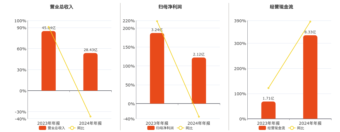 公司营业总收入为28.43亿元,较去年同报告期营业总收入减少16.60亿元,同比较去年同期下降36.87%。归母净利润为2.12亿元,较去年同报告期归母净利润减少1.13亿元,同比较去年同期下降34.73%。经营活动现金净流入为8.33亿元。