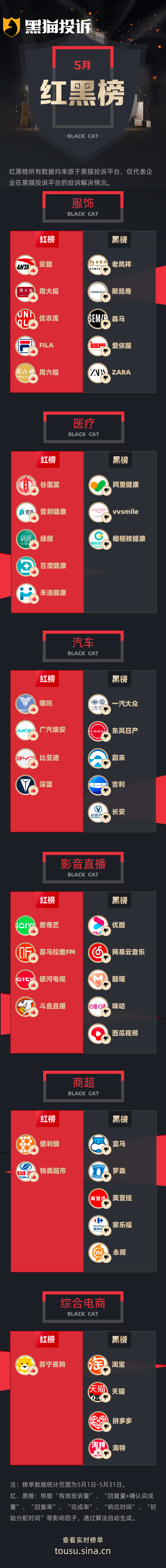黑猫投诉发布5月份企业投诉处理红黑榜单,数据均来源于黑猫投诉平台,反映了企业在黑猫投诉平台的投诉处理解决情况。