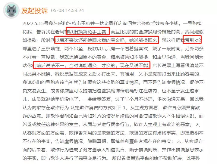 本月中,黄金品类热度不减,大量用户反馈在购买黄金的过程中,遭遇“一口价”、质量问题、以旧换新等问题较多,有消费者表示,在老凤祥以旧换新时,客服声称“不喜欢可以进行更换”,并诱导消费者将足金换购成了K金,后续却表示“不同品类无法更换”。截至5月底,老凤祥首都奥投诉679条,回复率为0。