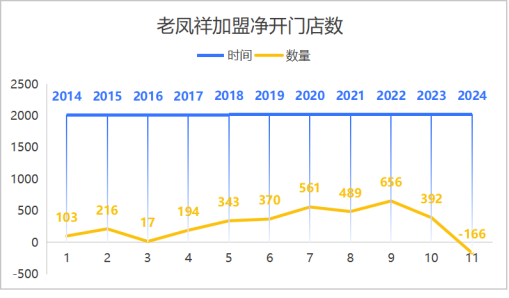 而到了2024年,老凤祥更是直接ldquo;掉头rdquo;,开始了缩减门店之路。数据显示,截至2024年末,其拥有境内外营销网点5838家,其中,直营店197家(含境外直营店15家),比期初净增加10家;加盟店5641家,比期初净减少166家。