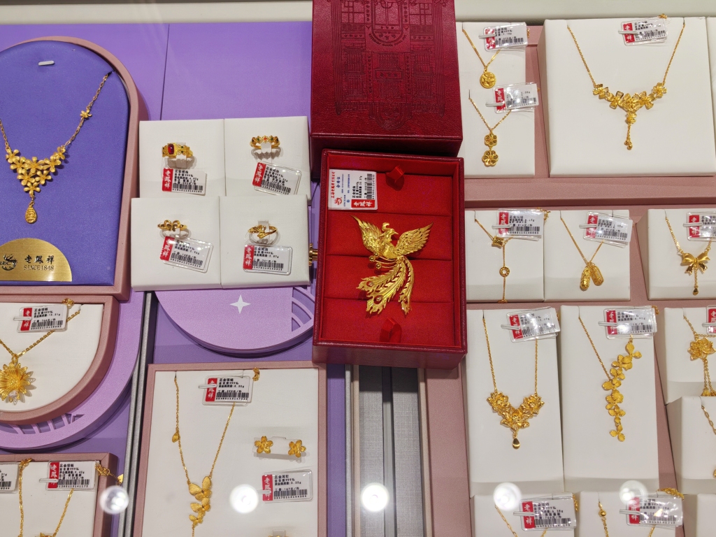 在老凤祥专柜前,尽管正值晚间消费高峰时段,前来咨询和选购黄金饰品的顾客却屈指可数。值得注意的是,这种冷清现象并非个例,与其位于同一片商区的六福珠宝、周大福、潮宏基等多家品牌专柜同样门庭冷落,许多柜台甚至一度出现了销售人员多于顾客的现象。