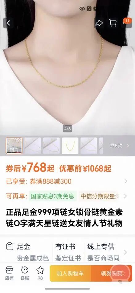经视直播记者联系许女士,她称今年10月底在淘宝浏览,被“老凤詳1848黄金官营店”促销活动吸引,看中一条0.8克、售价764元的黄金项链。下单前她向商家确认是否为正品足金,商家称是“正品足金999”,收到货项链标注“足金999老凤祥”,她未怀疑。几天后,许女士找到一家线下黄金加工店,“老板帮我检测,发现这条项链是金包银,金的含量不足1%,而银的含量高达90%以上。我当时完全傻了眼。没想到在淘宝上购买的项链竟然是假的。”