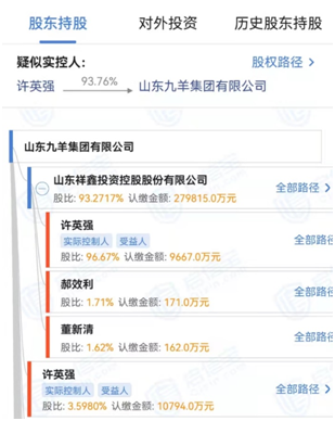 启信宝数据显示,九羊集团由山东祥鑫投资控股股份有限公司(以下简称山东祥鑫)持股93.27%,许英强持股3.6%。而许英强又持有山东祥鑫96.67%的股份,因此许英强为九羊集团的实控人,直接和间接持有九羊集团93.76%的股份。