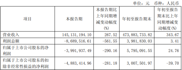 今年前三季度, 鑫源智造 实现营业收入4.74亿元,同比增长343.67%;归属于上市公司股东的净利润579.51万元,同比增长24.76%;归属于上市公司股东的扣除非经常性损益的净利润300.75万元,同比减少39.70%;经营活动产生的现金流量净额5964.19万元。