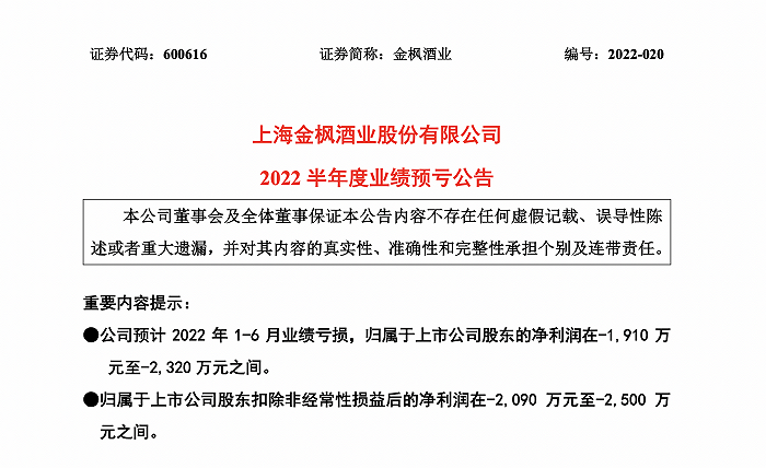 7月14日,上海金枫酒业股份有限公司(以下简称“金枫酒业”)(600616)发布《2022半年度业绩预亏公告》显示,预计今年1-6月业绩亏损,归属于上市公司股东的净利润约-1910万元至-2320万元;归属于上市公司股东扣除非经常性损益后的净利润约-2090万元至-2500万元.