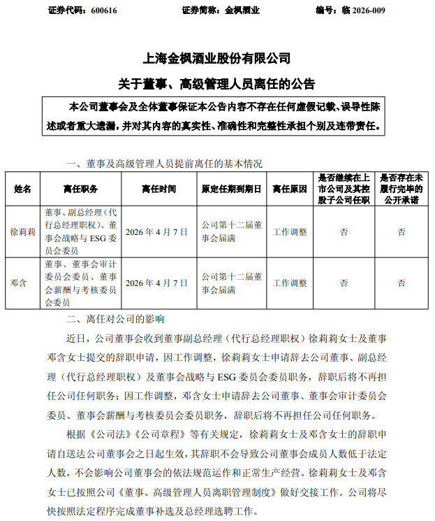 4月8日,金枫酒业发布公告称,公司董事、副总经理徐莉莉及董事邓含因“工作调整”提交辞职申请,两人辞职后均不再担任公司任何职务。此时距离徐莉莉开始代行总经理职权已超过两年,核心管理岗位的再度悬空,令这家扣非净利润已连亏六年的黄酒企业再度震荡。