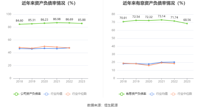 在偿债能力方面,公司2023年年末资产负债率为85.88%,相比上年末下降0.81个百分点;有息资产负债率为68.56%,相比上年末下降3.18个百分点。