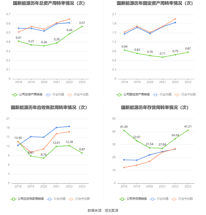 营运能力方面,2023年,公司公司总资产周转率为0.57次,上年同期为0.49次(2022年行业平均值为0.61次,公司位居同行业21/31);固定资产周转率为0.87次,上年同期为0.79次(2022年行业平均值为1.84次,公司位居同行业29/31);公司应收账款周转率、存货周转率分别为9.87次、41.21次。