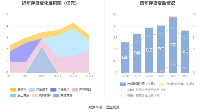 从存货变动来看,截至2023年年末,公司存货账面价值为3.26亿元,占净资产的8.84%,较上年末减少1.03亿元。其中,存货跌价准备为416.75万元,计提比例为1.26%。