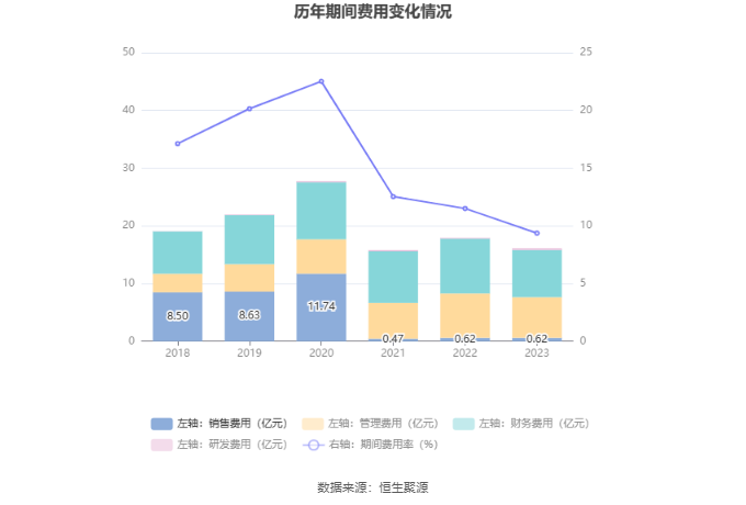 2023年,公司期间费用为16.11亿元,较上年同期减少1.83亿元;期间费用率为9.37%,较上年同期下降2.14个百分点。其中,销售费用同比增长0.3%,管理费用同比下降8.28%,研发费用同比增长102.81%,财务费用同比下降14.03%。