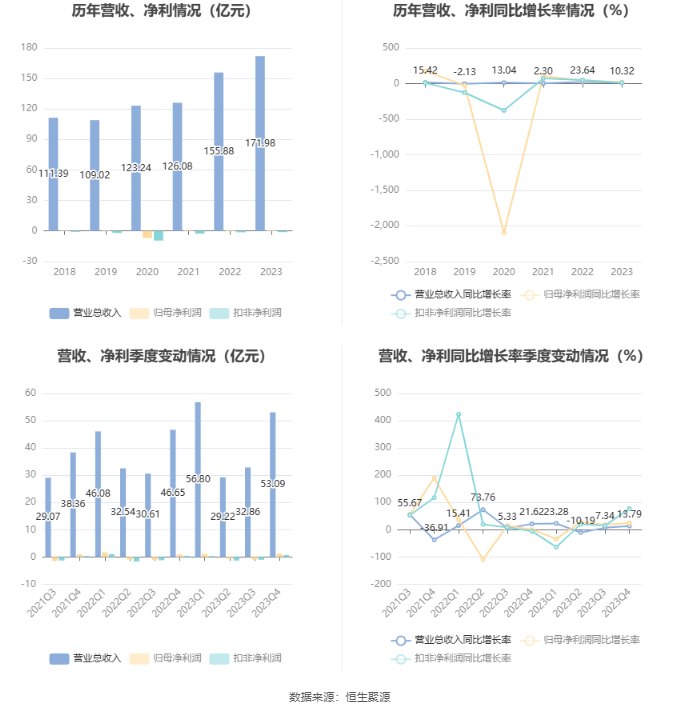 2023年,公司毛利率为9.54%,同比下降1.63个百分点;净利率为0.35%,较上年同期上升0.86个百分点。从单季度指标来看,2023年第四季度公司毛利率为11.03%,同比下降1.75个百分点,环比上升2.19个百分点;净利率为3.05%,较上年同期上升1.98个百分点,较上一季度上升6.12个百分点。