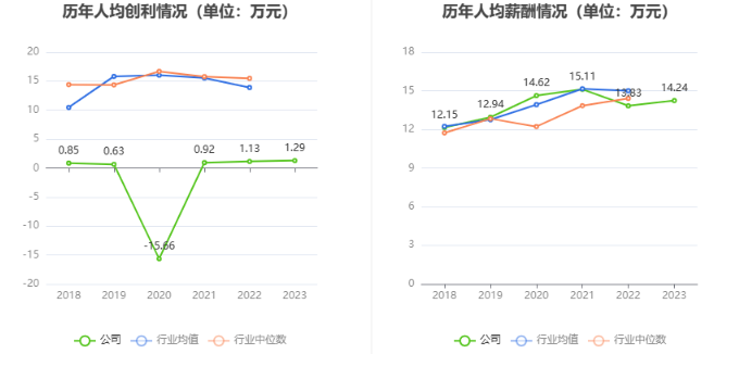 截至2023年末,公司员工总数为6061人,人均创收283.75万元,人均创利1.29万元,人均薪酬14.24万元,较上年同期分别增长5.76%、13.97%、2.94%。