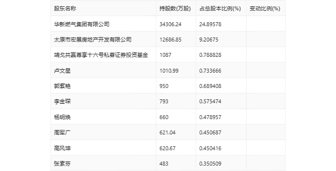 年报显示,2023年年末公司十大流通股东中,新进股东为杨明焕、张素芬,取代了三季度末的张建春、香港中央结算有限公司。在具体持股比例上,华新燃气集团有限公司持股有所下降。