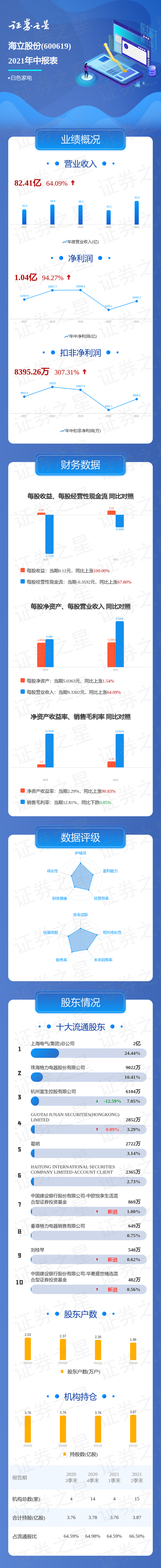证券之星数据中心讯,海立股份2021中报显示,公司主营收入82.41亿元,同比上升64.09%;归母净利润1.04亿元,同比上升94.27%;扣非净利润8395.26万元,同比上升307.31%;负债率68.58%,投资收益-841.98万元,财务费用7982.89万元,毛利率12.81%。
