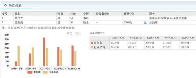 根据数据,盖剑高近年来的薪酬水平较为稳定。从2020年至2023年,他的薪酬分别为140万元、320万元、210万元和230万元。
