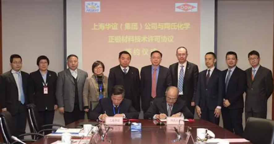 2018年1月陶氏化学与华谊集团签署技术许可协议。陶氏向华谊集团授权的技术为两种锂离子电池的正极材料:磷酸锂铁锰(LMFP)和锂镍锰钴氧化物(NMC)。