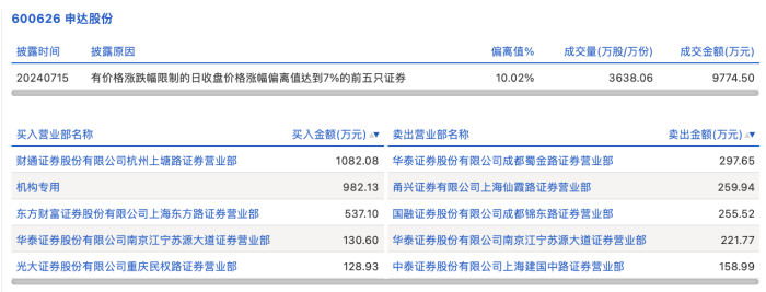 7月15日,申达股份今日涨停,龙虎榜数据显示,上榜营业部席位全天成交4054.7万元,占当日总成交金额比例为41.48%。其中,买入金额为2860.83万元,卖出金额为1193.87万元,合计净买入1666.96万元。