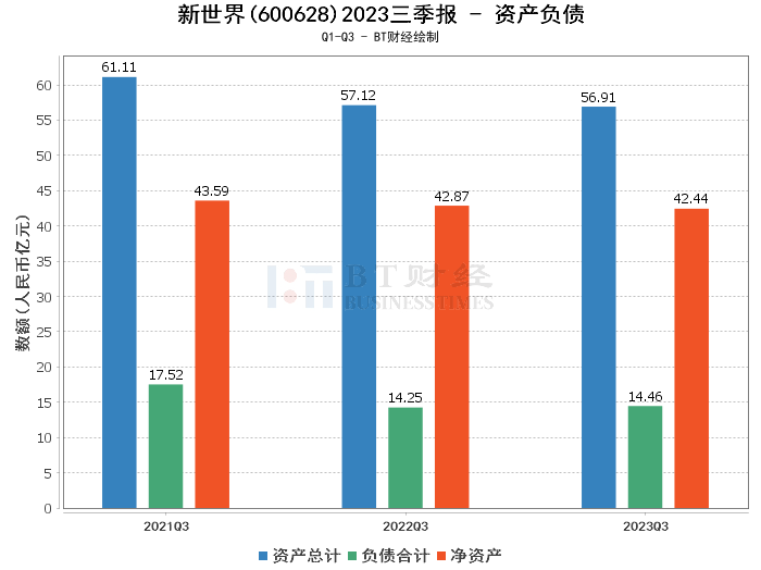 在资产负债方面,新世界公司2023年三季报显示,资产总计达到56.91亿元,与上年度末的57.16亿元相比略有下降。负债合计为14.46亿元,较上年度末的15.04亿元有所减少,显示出公司在财务管理方面的努力。净资产则从上年度末的42.12亿元增长到42.44亿元,资产负债率从26.31%降至25.42%,这表明公司的财务结构进一步优化,债务水平得到控制。
