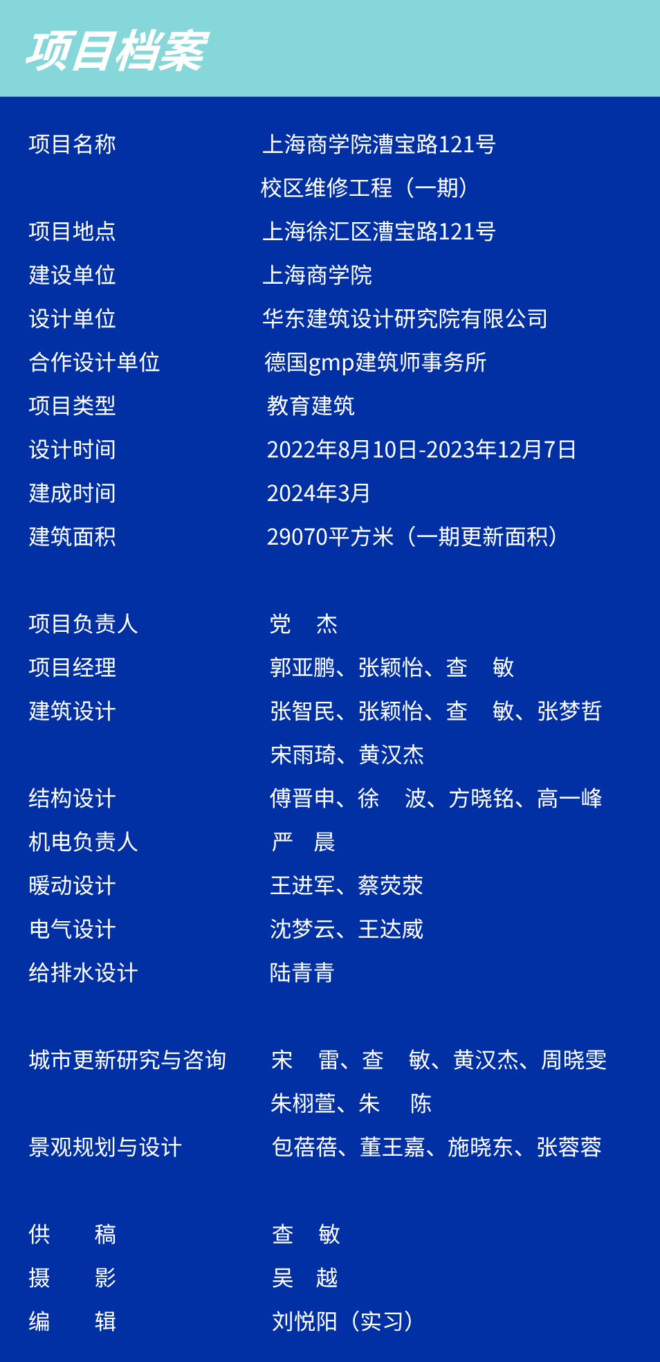 华建集团华东建筑设计研究有限公司(下文简称“华东院”)与德国gmp建筑师事务所联合设计助力上海商学院漕宝路校区建设,本校区的建设是在漕宝路121号(原上海应用技术大学)既有校区基础上进行更新。设计及筹划历时三年多余,于2024年初对外招生开放。自2021年开始至竣工后维护阶段,华东院作为学校的技术顾问展开了全阶段技术保驾护航服务,目前正在进行校园二期建设的配合技术工作。