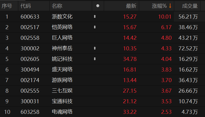 8月14日,游戏概念走强,截至14时20分,浙数文化涨停,恺英网络、巨人网络、姚记科技等跟涨。