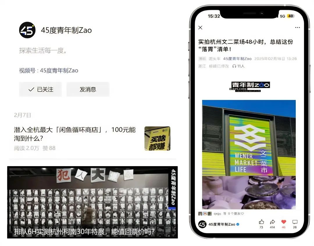 在45度平台的叙事中,品牌不再是单向输出的“广播站”,而是化身城市生活的“共情翻译官”——主账号“45度青年制Zao”以年轻人的好奇心为线索,用真实体验和轻量化攻略串联起城市的烟火气与新鲜感。一篇《排队6H实测杭州柯南30年特展,能值回票价吗?》将二次元情怀转化为实用避坑指南;《实拍文二菜场48小时,总结这份“落胃”清单》把菜场阿姨的吆喝声变成治愈系城市散文;《潜入全杭最大【闲鱼循环商店】,100元能淘到什么?》则用镜头记录旧物新生,让可持续生活变得可触可感。