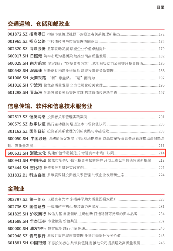 近日,中国上市公司协会投资者关系管理专业委员会工作会议在北京举办,同期发布上市公司投资者关系管理最佳实践评选结果,共评选出392个最佳实践案例。浙数文化凭借多年来优异的投资者关系管理工作及创新实践,首次入选中国上市公司协会“投资者关系管理最佳实践案例”,并作为最具代表性的80家公司案例之一被汇编入册。