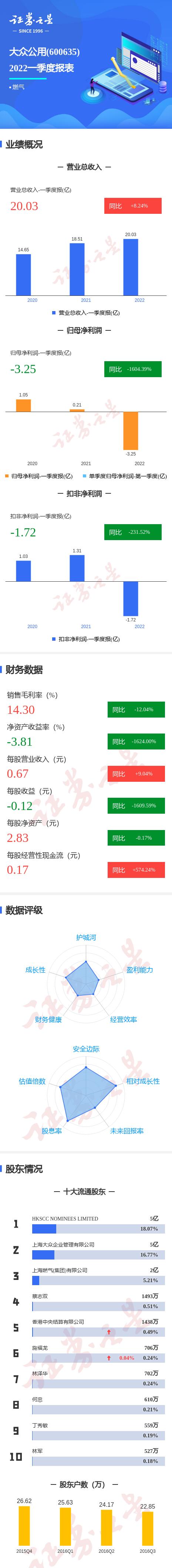 大众公用2022一季报显示,公司主营收入20.04亿元,同比上升8.24%;归母净利润-32532.96万元,同比下降1604.39%;扣非净利润-17238.81万元,同比下降231.52%;其中2022年第一季度,公司单季度主营收入20.04亿元,同比上升8.24%;单季度归母净利润-32532.96万元,同比下降1604.39%;单季度扣非净利润-17238.81万元,同比下降231.52%;负债率59.34%,投资收益-18990.05万元,财务费用8073.44万元,毛利率14.3%。