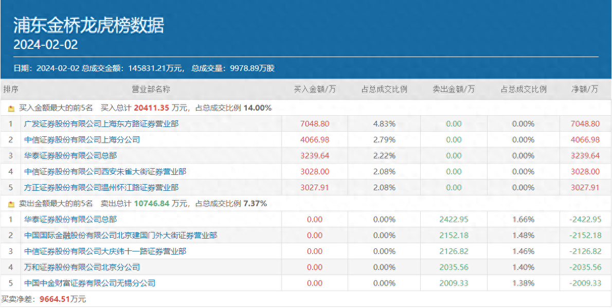 盘后披露的龙虎榜数据显示,浦东金桥当日买方前四个席位均被知名游资常用席位所占据,合计的买入金额为1.74亿元,占该股当日总成交额的比例约为11.92%。