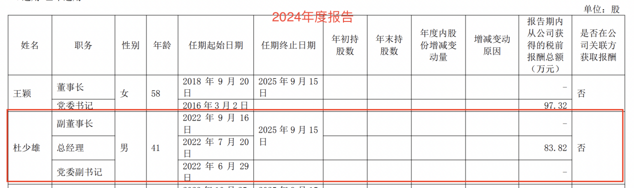 薪酬方面,2023年、2024年,杜少雄薪酬分别为58.48万元、83.82万元。据此可知,2024年其薪酬增长25.34万元,增幅为43.33%。