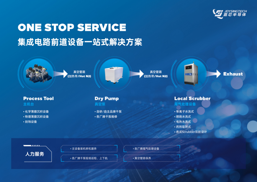 嘉芯半导体从全流程出发,覆盖CVD/PVD/刻蚀等主工艺设备→真空泵→尾气处理设备,为客户构建一站式设备解决方案。