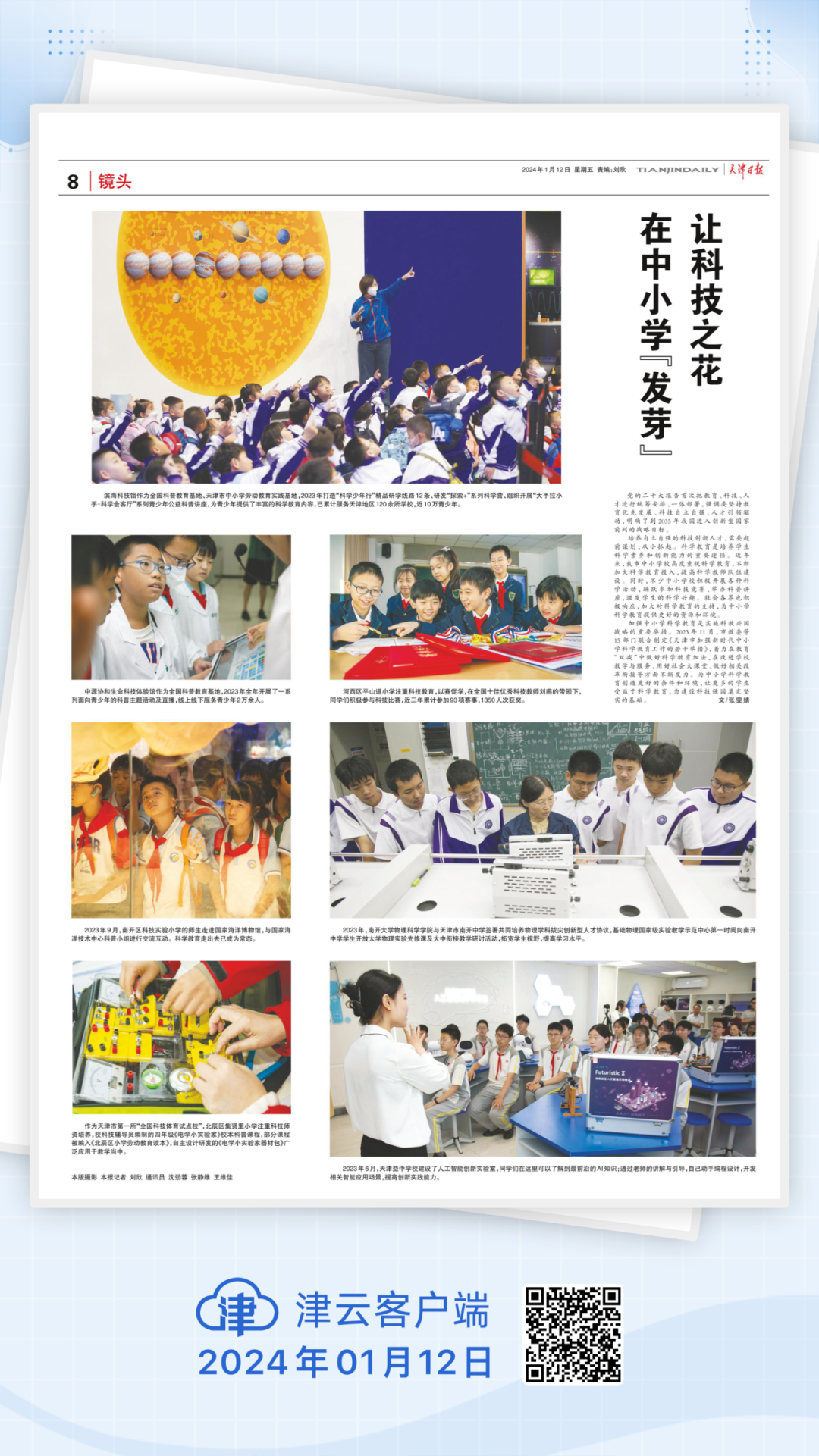 1月12日,中源协和生命科技体验馆登上《天津日报》,科普教育工作再获肯定!中源协和生命科技体验馆作为全国性科普教育基地,积极开展公益讲座、学术沙龙,科技夏令营等覆盖全年龄层次的科普活动,其中青少年是科普工作的重点人群。2023年,中源协和全国科普教育基地线上、线下共服务青少年2万余人。