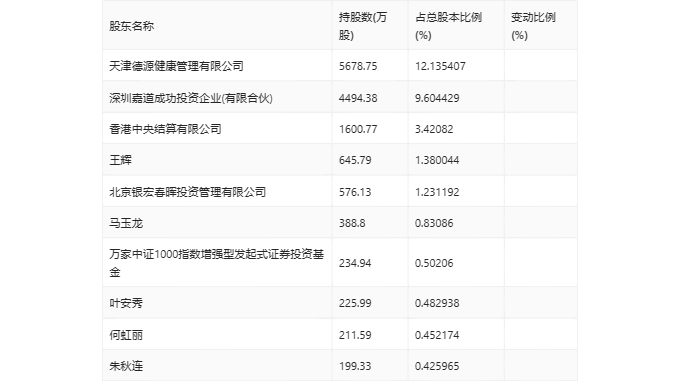 一季报显示,2024年一季度末公司十大流通股东中,新进股东为万家中证1000指数增强型发起式证券投资基金、何虹丽,取代了上年末的陈世辉、朱成光。在具体持股比例上,王辉、马玉龙持股有所上升,香港中央结算有限公司、朱秋连持股有所下降。