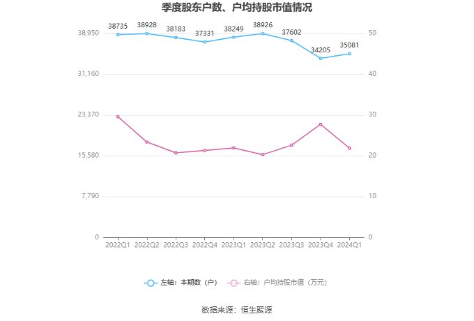 筹码集中度方面,截至2024年一季度末,公司股东总户数为3.51万户,较上年末增长了876户,增幅2.56%;户均持股市值由上年末的27.73万元下降至21.88万元,降幅为21.10%。