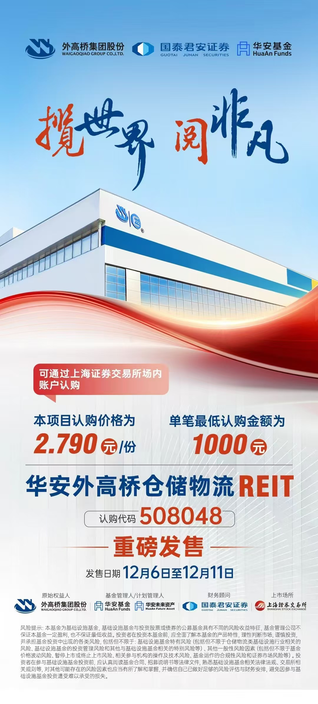 上海首单仓储物流基础设施REITs发售在即!以上海外高桥集团股份有限公司作为原始权益人、华安基金管理有限公司作为基金管理人、国泰君安证券股份有限公司担任财务顾问的“华安外高桥仓储物流封闭式基础设施证券投资基金”,于11月20日正式获批(证监许可〔2024〕1623号),将于12月6日起公开发售,单笔最低认购金额1000元。