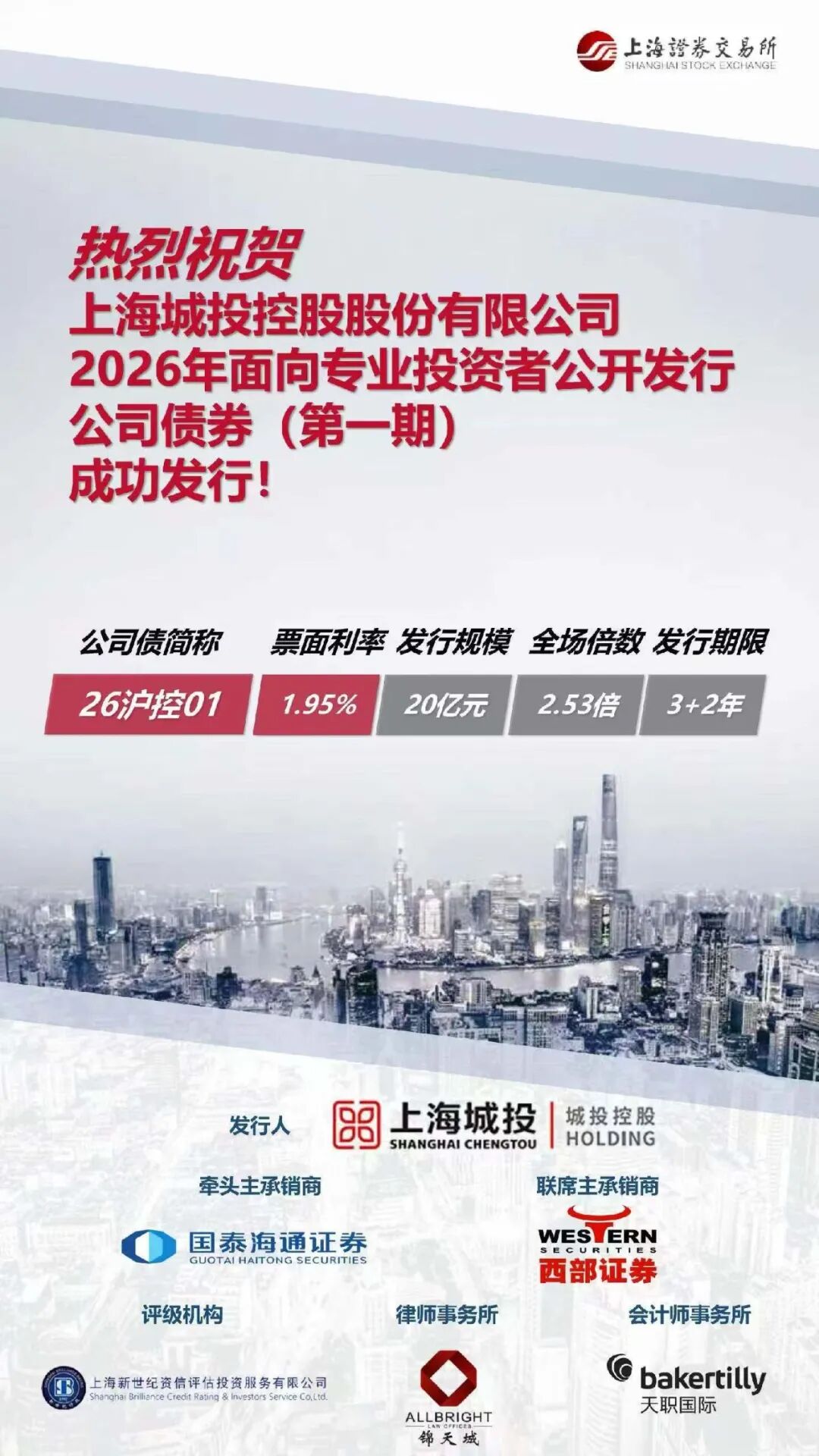 上海城投控股股份有限公司(以下简称“公司”)2026年面向专业投资者公开发行公司债券(第一期),于3月11日成功发行!