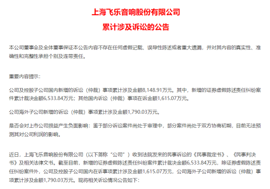 同时,飞乐音响表示,截至公告日,针对公司已收到上海金融法院受理的新增原告诉公司证券虚假陈述责任纠纷案件,公司在2020年已计提预计负债基础上补充计提0.83亿元。