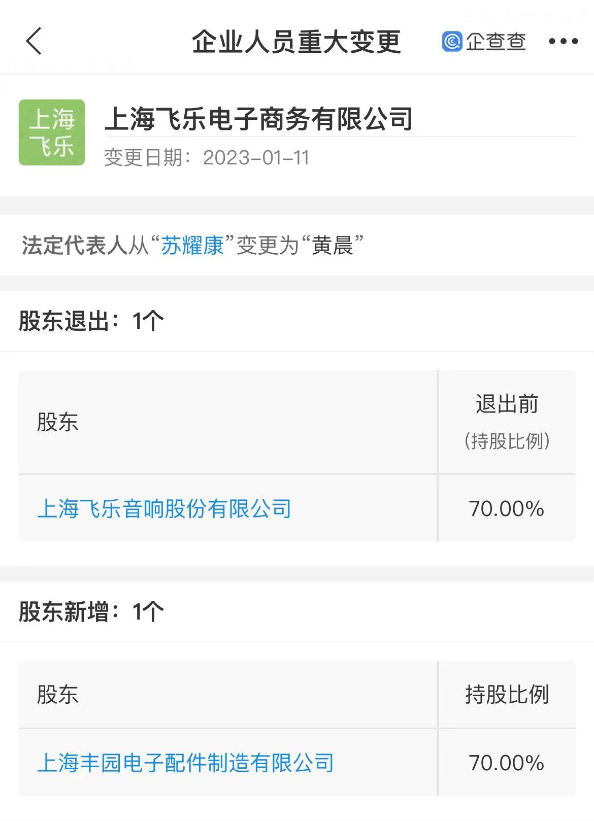 1月11日,据企查查,上海飞乐音响股份有限公司(以下简称“飞乐音响”)转让上海飞乐电子商务有限公司(以下简称“飞乐电子商务”)70%股权,上海丰园电子配件制造有限公司(以下简称“丰园电子”)接盘。