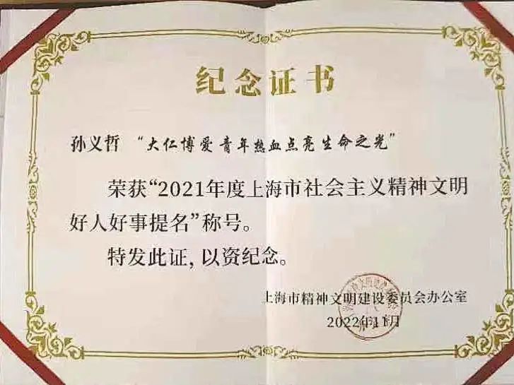 图片|▲孙义哲荣获“2021年度上海市社会主义精神文明好人好事提名”称号