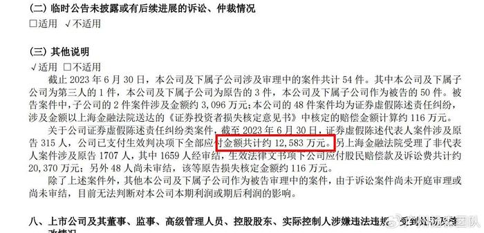 2023年8月31日,飞乐音响发布《2023年半年度报告》,关于公司证券虚假陈述责任纠纷类案件,截至2023年6月30日,证券虚假陈述代表人案件涉及原告315人,公司已支付生效判决项下全部应付金额共计约12,583万元。另上海金融法院受理了非代表人案件涉及原告1707人,其中1659人经审结,生效法律文书项下公司应付股民赔偿款及诉讼费共计约20,370万元;另外48人尚未审结,该等原告损失核定金额约116万元。