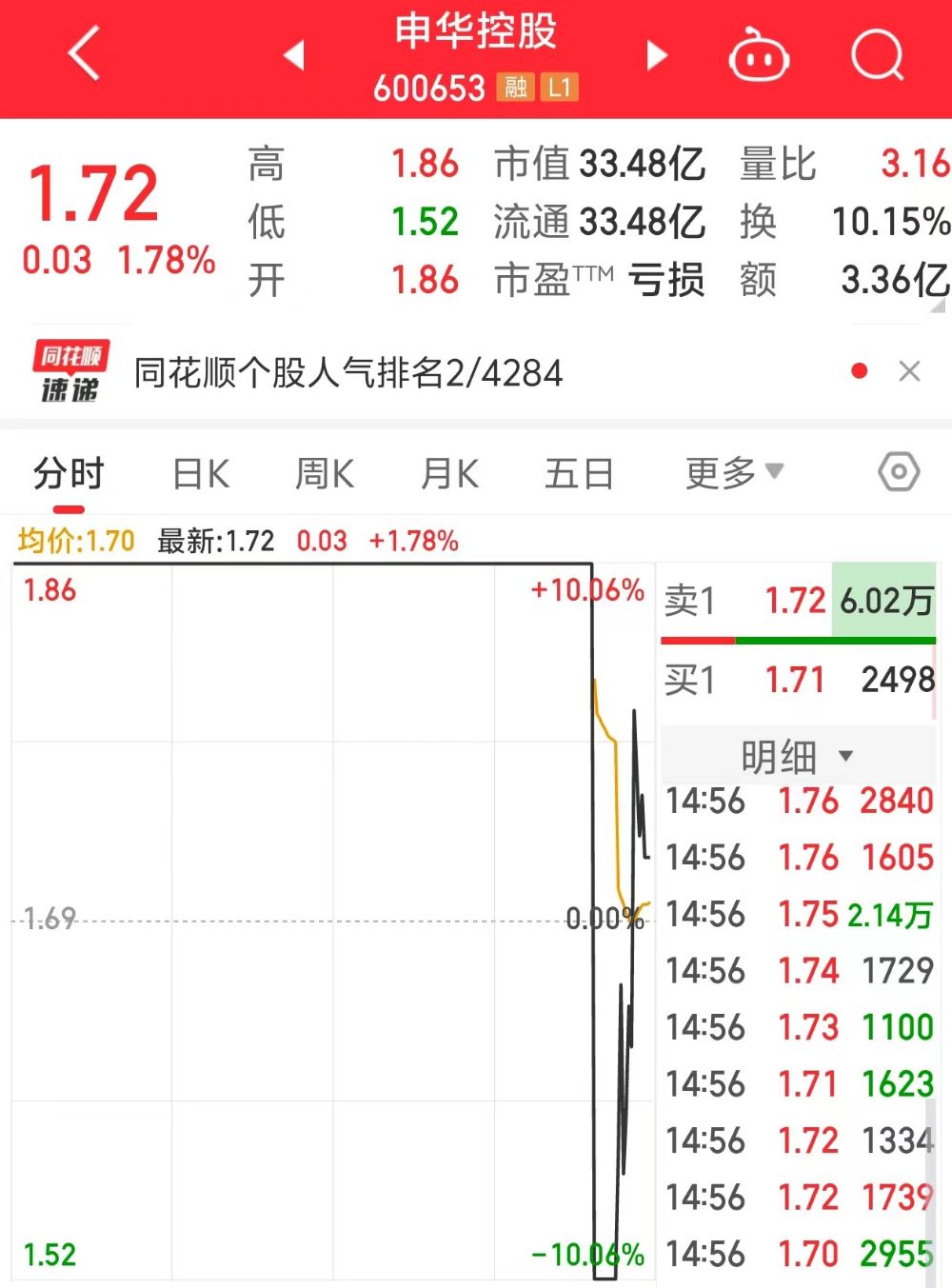6月5日,申华控股(600653.SH)开盘一字涨停,但午后不久便快速下跌至跌停,上演“天地板”行情。截至收盘,申华控股股价收涨1.78%,报1.72元。此前,该股已连续4个交易日涨停。