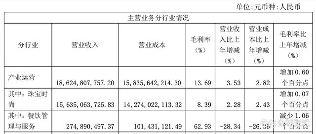 以2022年半年报为例,豫园股份实现营业收入220亿元,其中黄金珠宝业务实现营收156亿元,占比超过到70%为主营业务。豫园股份拥有“老庙”和“亚一”两大黄金珠宝品牌,但是珠宝业务毛利率颇低,2022年上半年仅为8.39%。