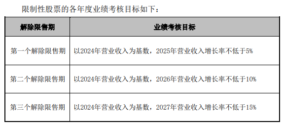 股权激励计划和员工持股计划对业绩的考核基本一致,公司层面仅仅考核营业收入的增长,第一个限售期(解锁期)的考核目标为:以2024年营业收入为基数,2025年营业收入增长率不低于5%;第二个限售期(解锁期)的考核目标为:以2024年营业收入为基数,2026年营业收入增长率不低于10%;第三个限售期(解锁期)的考核目标为:以2024年营业收入为基数,2027年营业收入增长率不低于15%。