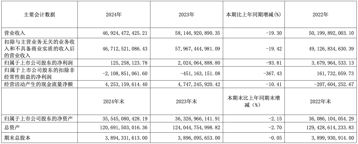 3月24日晚间,豫园股份发布2024年年度报告显示,全年实现营业收入469.24亿元,同比下降19.30%;归属于上市公司股东的净利润1.25亿元,同比下降93.81%;归属于上市公司股东的扣除非经常性损益的净亏损21.09亿元;基本每股收益为0.032元。报告期末资产负债率67.82%,较上年同期降低0.21%。