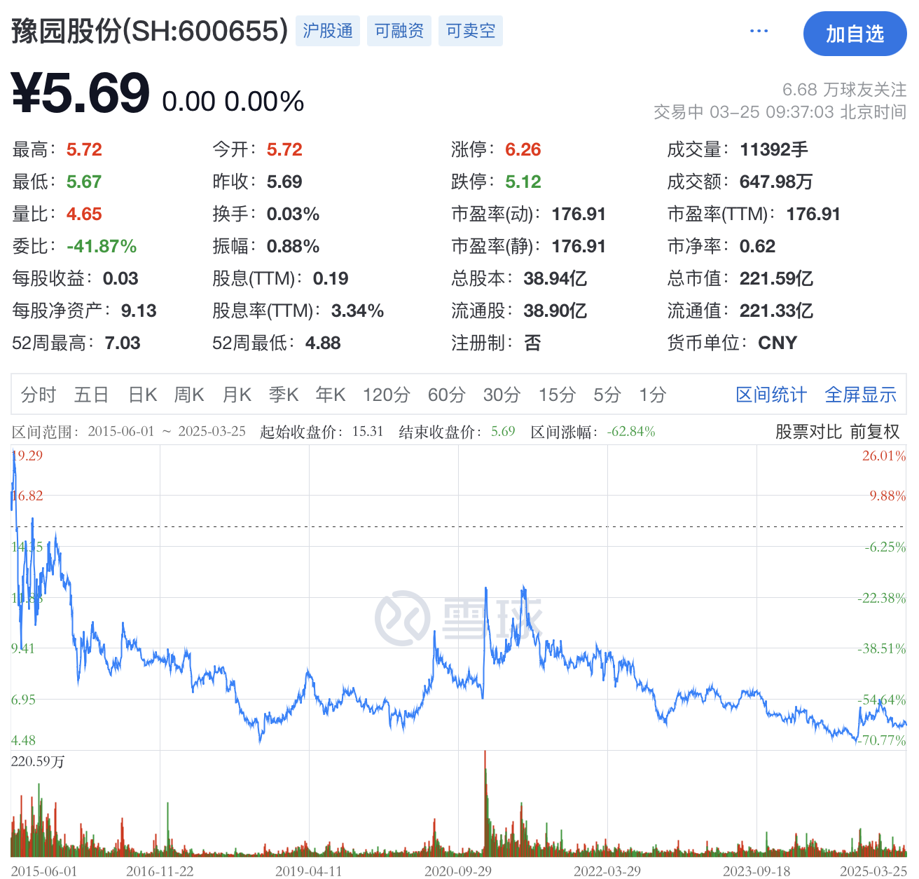 二级市场上,截至发稿,豫园股份报5.69元,总市值222亿元。公司股价自2015年6月高点以来已跌去六成。