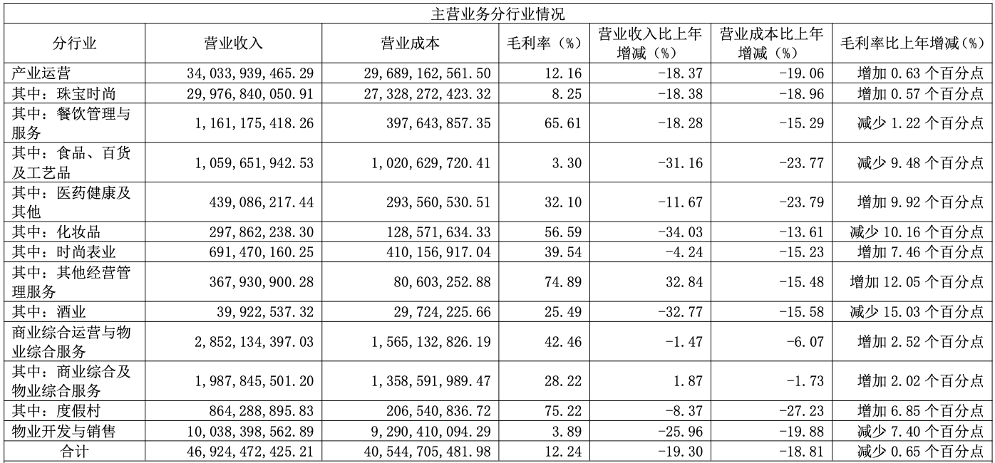在年报中,豫园股份解释,营业收入同比下降19.30%,主要系报告期内受宏观经济影响及消费行业结构调整,叠加国际金价震荡波动加剧,导致国内消费增长乏力,致使公司部分产业运营业务营业收入同比下降,同时公司物业开发与销售业务因房地产行业整体下行趋势引起营业收入同比下降综合导致公司整体营业收入下降。