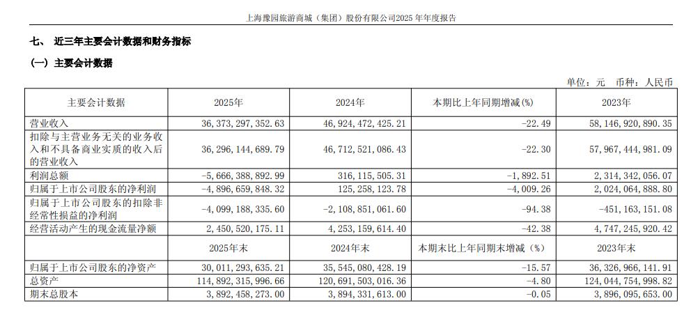 3月23日盘后,豫园股份(600655)披露2025年年度报告。报告显示,公司全年实现营业收入363.73亿元,同比下滑22.49%;归属于上市公司股东的净利润则为-48.97亿元,同比暴跌4009.26%;公司扣非后净利润为-40.99亿元,较2024年的-21.09亿元进一步扩大94.38%。