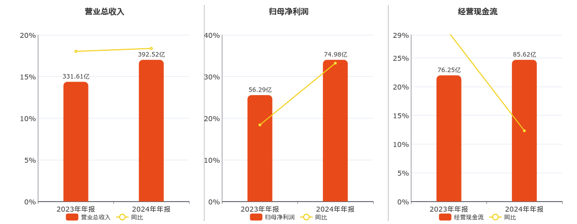 公司营业总收入为392.52亿元。归母净利润为74.98亿元。经营活动现金净流入为85.62亿元。