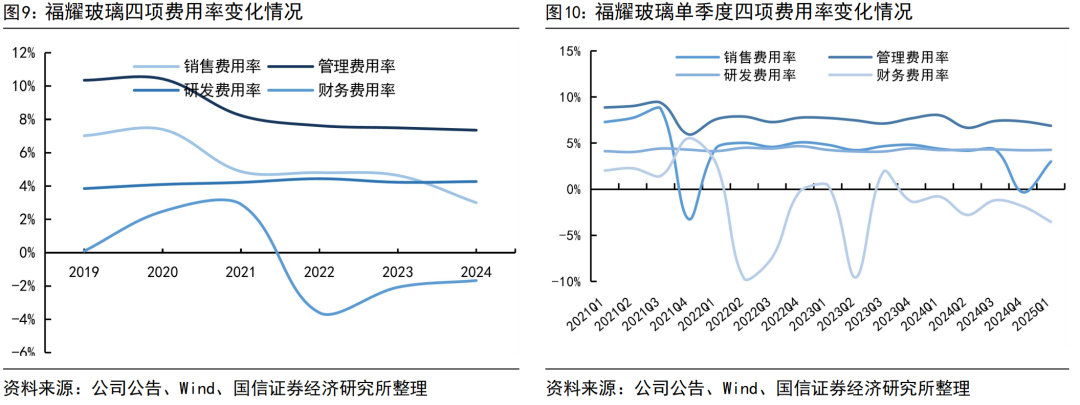 25Q1公司管理费用率同比下降1.14pct,降本增效持续推进。公司2025年第一季度四费率为10.65%,同比-5.3pct,其中销售/管理/研发/财务费用率分别为3.02%/6.89%/4.27%/-3.53%,同比变动-1.37/-1.14/0.01/-2.75pct,销售费用率波动较大,主要受公司24年为进一步加强对汽车玻璃全工业链可追溯质量管理体系,将包装费用调整到营业成本影响,管理费用受益于公司降本增效持续下降。